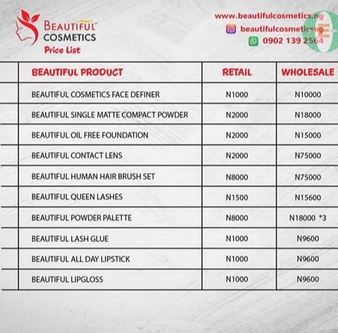 View All AdsBeautiful cosmetics powder palette, foundation, face-definer highly-rated, foundation,matte powders www.beautifulcosmetics.ng www.beautifulcosmetics.webs.com whatsapp 07037520751.