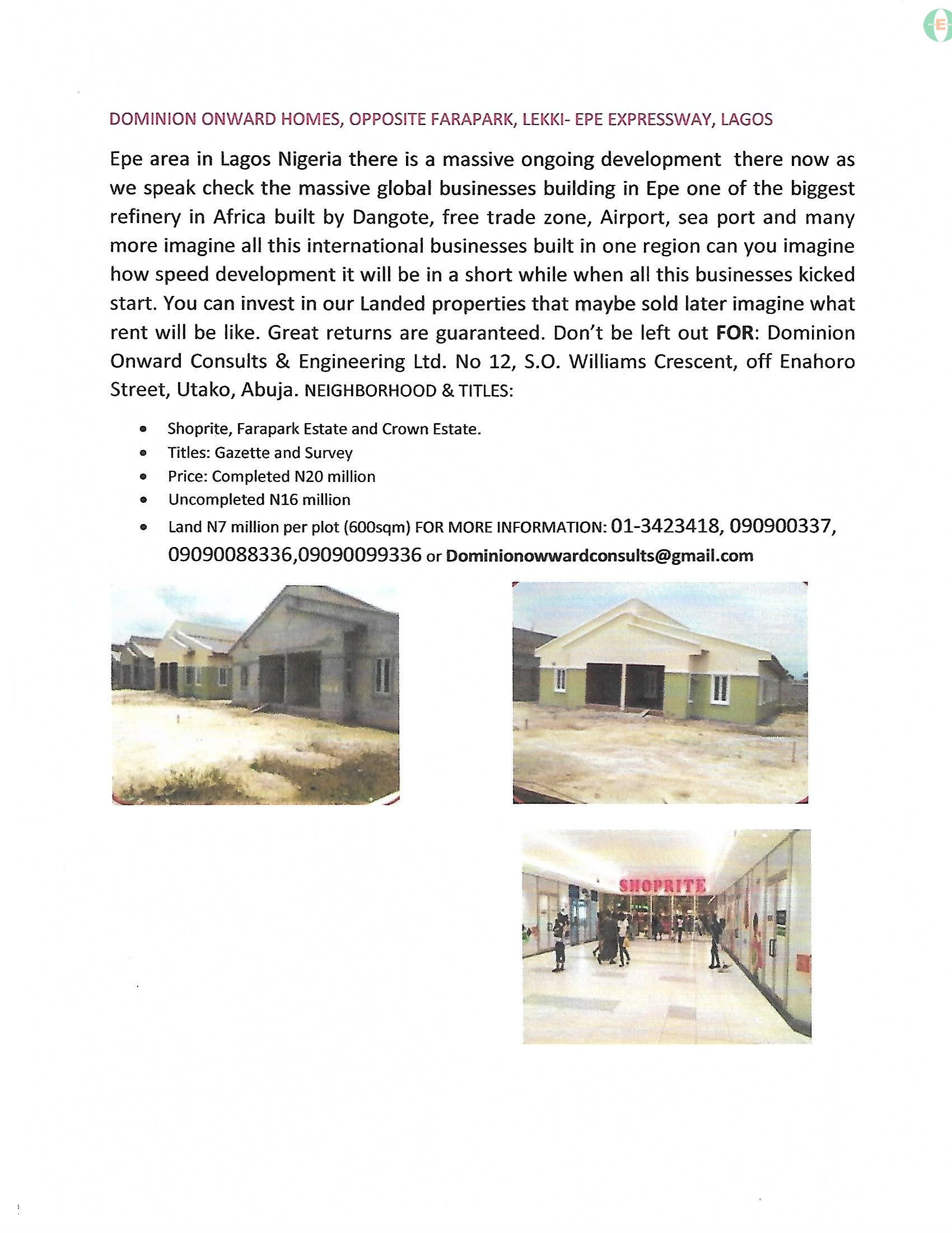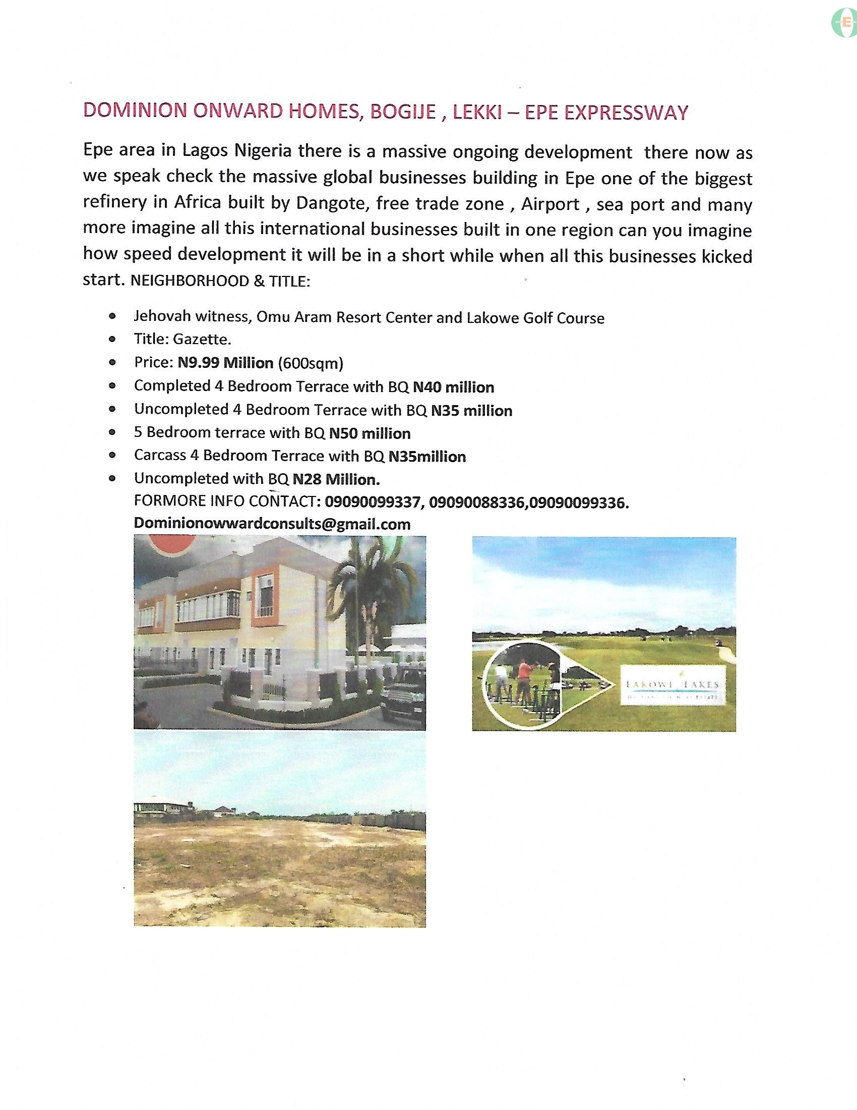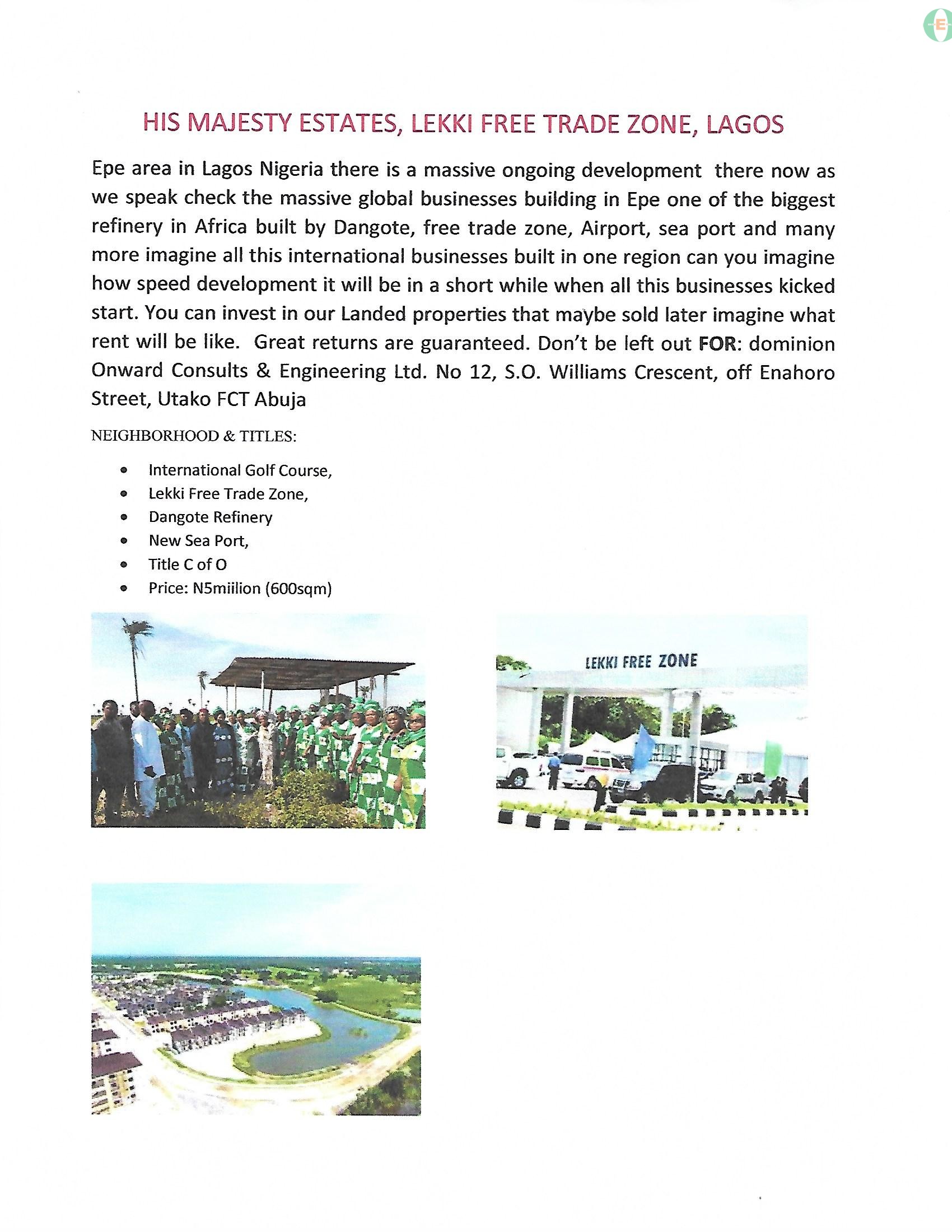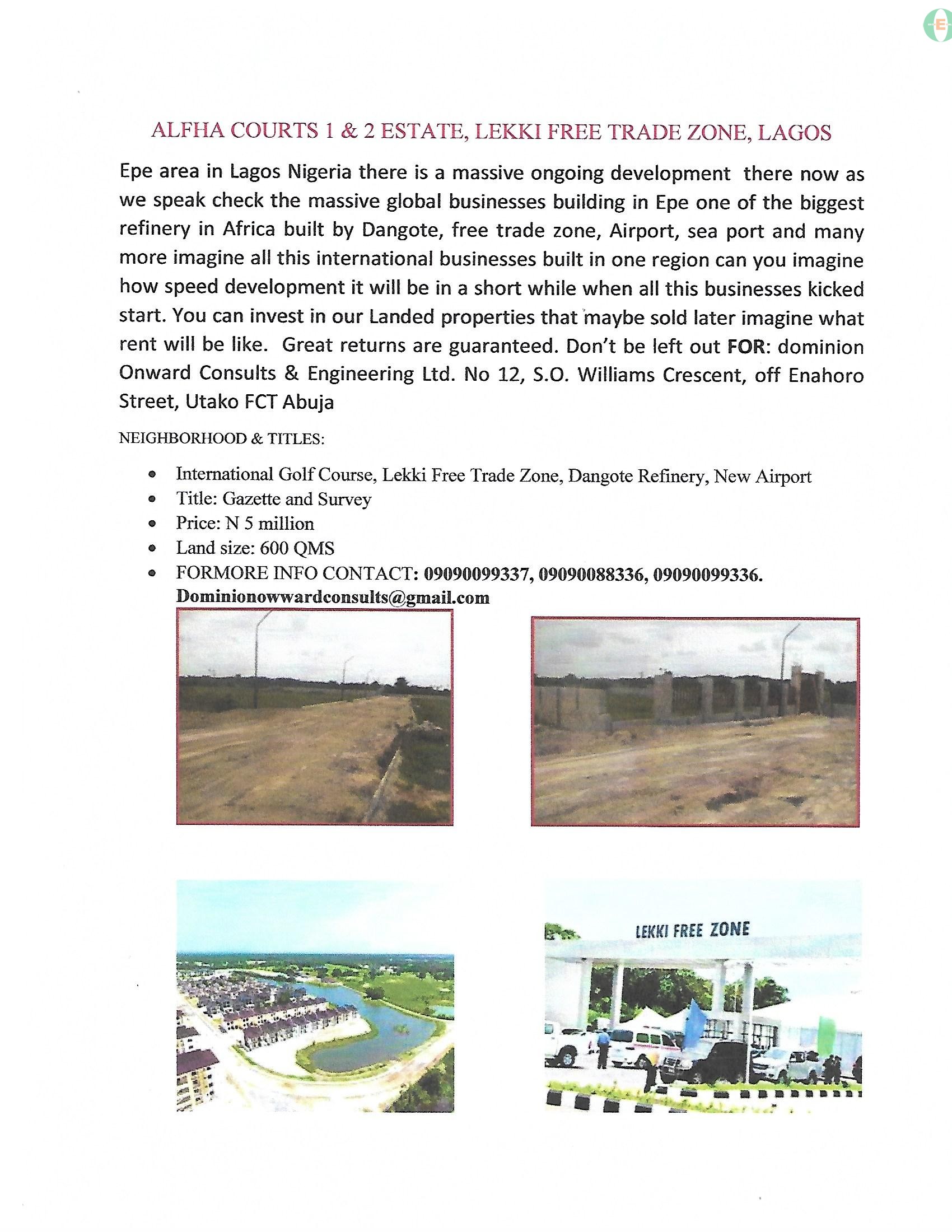 View All AdsEpe area in Lagos Nigeria there is a massive ongoing development there now as we speak check the massive global businesses building in Epe one of the biggest refinery in Africa built by Dangote, free trade zone , Airport , sea port and many more imagine all this international businesses built in one region can you imagine how speed development it will be in a short while when all this businesses kicked start. You can invest in our Landed properties that maybe sold later imagine what rent will be like. Great returns is guaranteed. Don’t be left out FOR: dominion Onward Consults & Engineering Ltd. No 12, S.O. Williams Crescent, off Enahoro Street, Utako FCT Abuja NEIGHBORHOOD & TITLES: • International Golf Course, Lekki Free Trade Zone, Dangote Refinery, New Airport • Title: Gazette and Survey • Price: N 5 million • Land size: 600 QMS • FORMORE INFO CONTACT: 09090099337, 09090088336, 09090099336. Dominionowwardconsults@gmail.com
